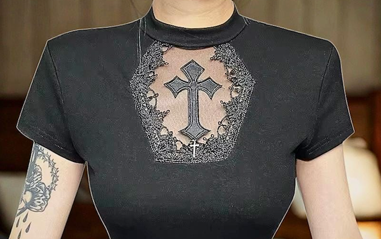 Turtleneck Top Y2K Black Gothic Cross Hollow Long Sleeve Sexy Tee Girls Harajuku Streetwear